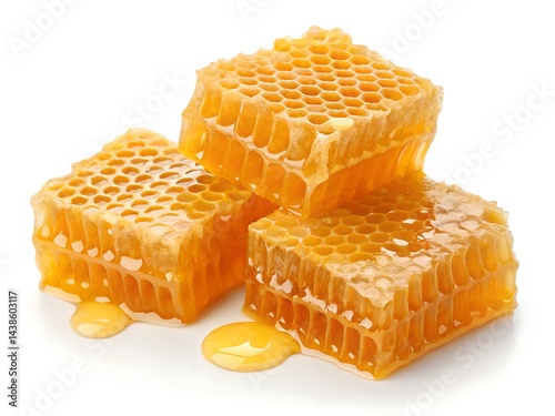 Golden Honeycomb Pieces Stacked with Dripping Honey Isolated on White Background