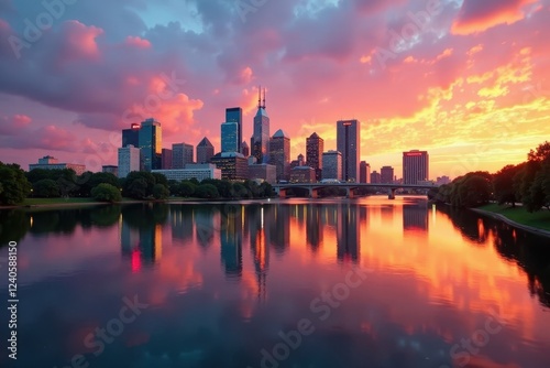 Golden hour Detroit skyline reflected in river, cityscape panorama, skyline, downtown