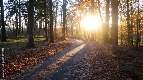 Golden Hour Glow on a Quiet Path in a Scenic Autumn Forest : Generative AI