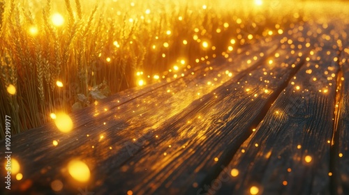 Golden Hour Glow Over Wooden Pathway Surrounded by Wheat Fields with Sparkling Lights Creating a Magical and Enchanting Atmosphere in Nature