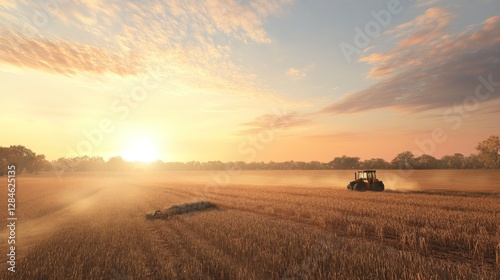 Golden Hour Harvest: Tractor in a sunlit field at sunrise