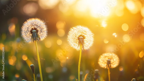 Golden hour illuminates dandelion clocks, evoking a sense of peace and gentle warmth on a summer day.