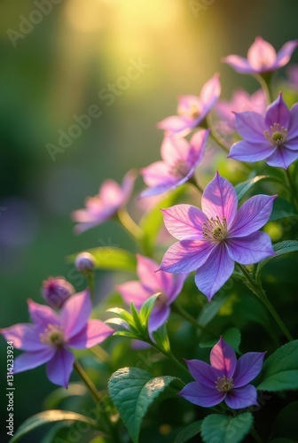 Golden Hour Illumination of Delicate Lilac Blooms in a Lush Garden Setting