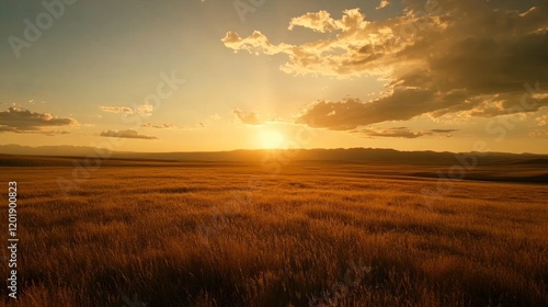 Golden Hour Prairie Landscape with Sun Burst and Distant Mountains under Sky