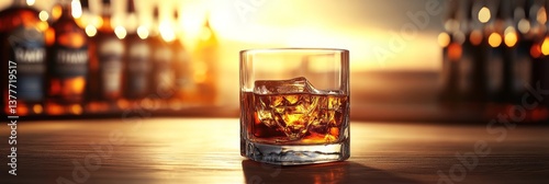 Golden Hour Relaxation Single Glass of Whiskey with Ice on a Bar, Blurred Bottles Background