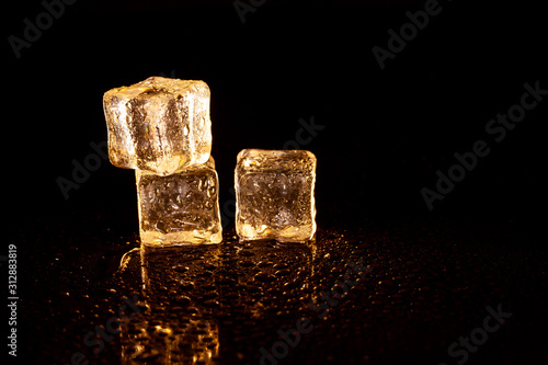 Golden ice cubes on black background.