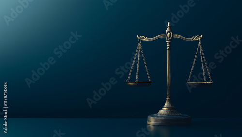 Golden justice scales with minimalistic composition on dark blue gradient background