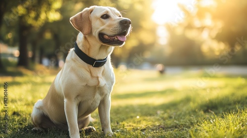 Golden labrador retriever enjoying sunny day in the park sits calmly