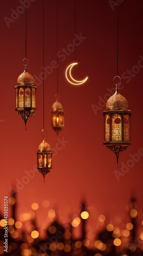 Golden Lanterns and Crescent Moon on Red Background. Islamic Decoration Concept