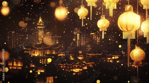 Golden lanterns over a city skyline at night. Possible use Stock photo for greeting card, holiday decorations