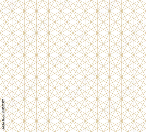 Golden lines texture. Vector geometric seamless pattern with delicate grid, lattice, net, thin diagonal lines, hexagons, rhombuses, triangles. Abstract graphic background. Trendy repeatable design