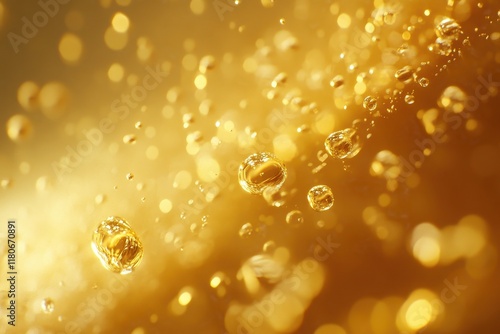 Golden liquid droplets float on amber background. Ideal for luxury, wellness, or cosmetic projects.