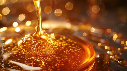 Golden liquid pouring into a pool, creating a beautiful pattern with air bubbles.
