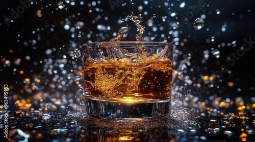 Golden Liquid Splashing in a Glass with Bokeh Background