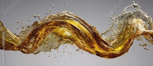 Golden Liquid Wave in Motion Against Gray Backdrop Studio Shot Abstract Fluid Dynamics