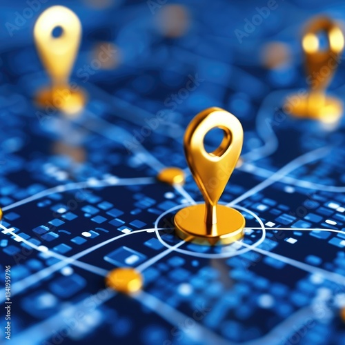 Golden Location Markers on a Digital Map GPS Navigation Technology Concept