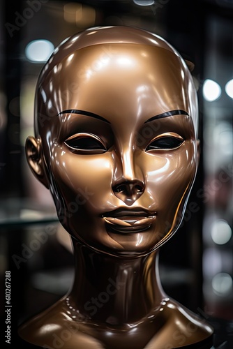 Golden mannequin head of a female model in sepia tone, with shiny and captivating eyes. Generative AI