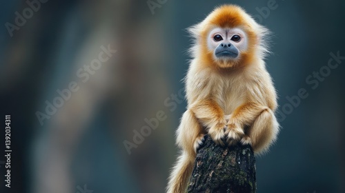 Golden monkey on a tree stump, zoo habitat, calm expression