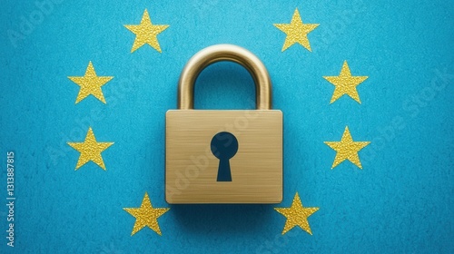 Golden Padlock with Keyhole on Blue Background and Yellow Stars