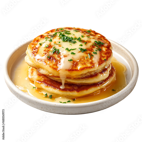 Golden pancakes drenched in syrup and butter topped with fresh herbs served on a small plate