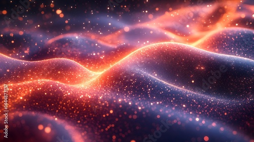 Golden particles stream across smooth, undulating purple and orange waves, creating a dreamy visual effect on a transparent background, PNG image, PNG file.