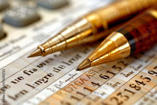 Golden pen in a firm grip hovers over a financial report, punctuating important metrics amidst rows of figures and fiscal summaries. business professional's hand with a shiny pen selects critical data