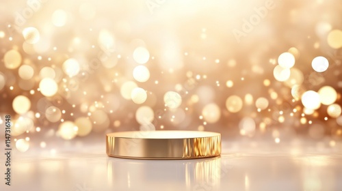 Golden podium on a reflective white surface with soft golden bokeh lights floating above and around, creating a luxurious ambiance