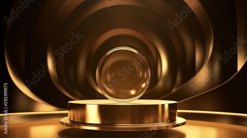 Golden podium with round frame on black background. Award ceremony concept. 3D rendering.Generative Ai