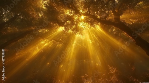 Golden Rays of Sunlight Filtering Through Ancient Trees
