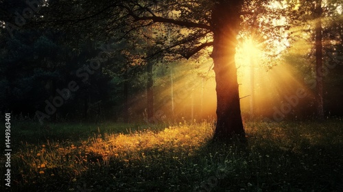 Golden rays of sunlight illuminate the forest at dawn or dusk
