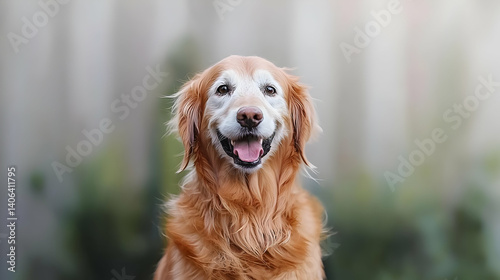 Golden Retriever Dog With Snow On Face Smiling Outdoors in Winter with Blurred Green Background