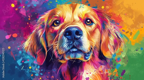 golden retriever in colorful confetti style, vibrant and dynamic composition, textured and artistic design, bold and cheerful tones