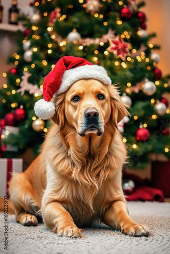 Golden Retriever in Santa Hat by Christmas Tree
