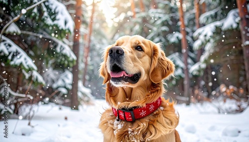 Golden Retriever in Snowy Forest with Red Collar