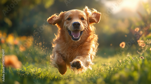 Golden Retriever joyfully running across a green grassy field in the sunlight: The dogâs legs are fully extended as it runs, ears flapping in the wind, with a joyful expression on