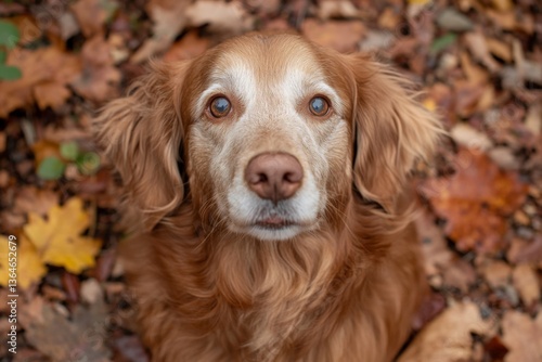 Golden retriever looking up among autumn leaves in a forest setting during a sunny day