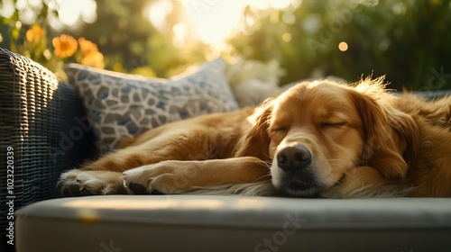 Golden retriever peacefully sleeping on a porch sofa in a sunlit backyard, with shallow depth of field and warm tones creating a cozy outdoor atmosphere for an inviting summer scene.