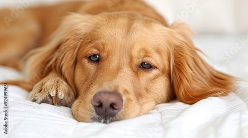 Golden Retriever Puppy Sleeping on White Sheet Bed
