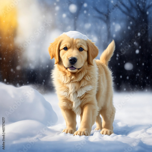 Golden Retriever puppy with expressive eyes and a wagging tail, eagerly waiting for its owner in a snowy winter landscape