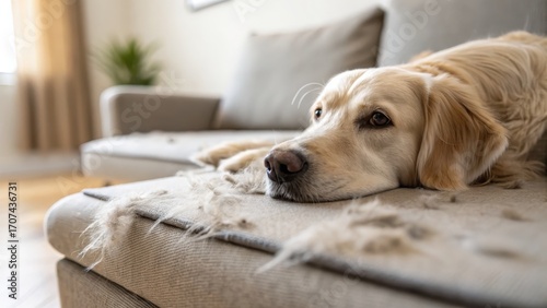 Golden Retriever Relaxing on Sofa with Shedding Fur