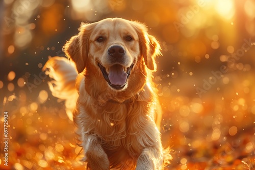 Golden Retriever Running Through Autumn Leaves at Sunset