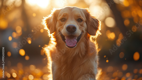 golden retriever running towards camera, joyful expression, surrounded by autumn leaves and warm sunlight. scene captures essence of happiness and playfulness