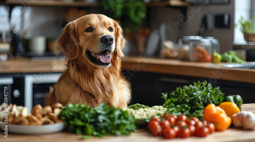 golden retriever sits happily in kitchen surrounded by fresh vegetables and herbs, creating warm and inviting atmosphere. scene captures joy of cooking with furry friend