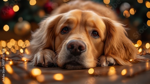 Golden Retriever Surrounded by Christmas Decorations on the Floor