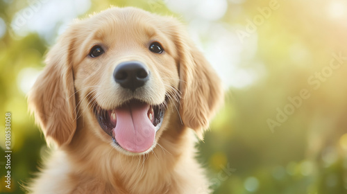 Golden Retriever's Sunny Smile: A close-up captures a golden retriever's joyous expression with a tongue, set against a vibrant bokeh background of a sunny outdoor scene.