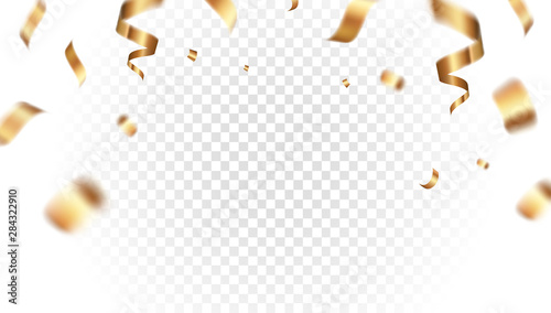 Golden ribbons vector design. Transparent luxury flying gold confetti in empty space. Elegant festive decoration for photo, gift card or web banner template