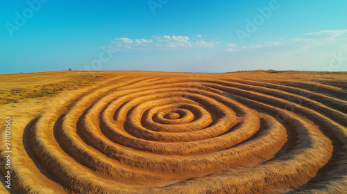 Golden Sandstone Plateau with Symmetrical Spiral Patterns and Clear Blue Sky from Above