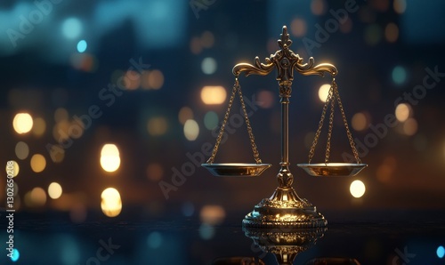 golden scale of justice, set against the backdrop of a courtroom at night. The background is blurred with bokeh lights and shadows to give it depth