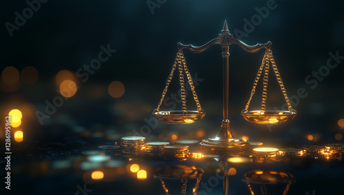 Golden Scales of Justice on a Bed of Coins Law Finance and Equity Concept