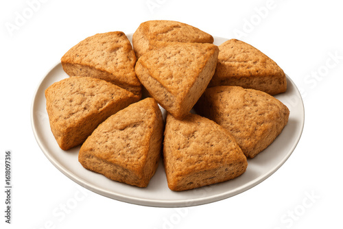 Golden scones cooling on pristine white plate, warm bakery treat displaying flaky texture and appetizing golden-brown surface